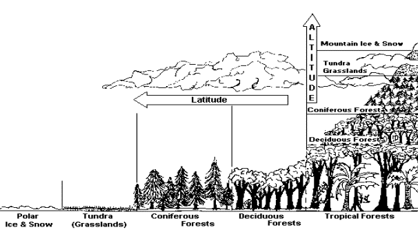 The figure below shows how forests ecosystems change as Latitude and Altitude increase