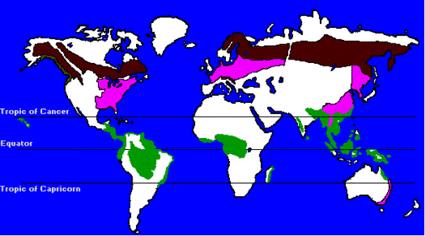 Between the Tropics of Capricorn and Cancer, there are many types of forests such as: Moist Tropical Forests, Dry Tropical Forests, Riverine Forests, Mangrove Forests, and Cloud Forests.